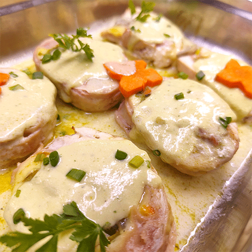 Rolls de pollo rellenos en crema blanca